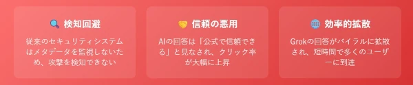 この攻撃の特徴は、一般的なフィッシング詐欺とは違い、Xの広告機能とAIの応答機能を組み合わせ、AIが持つ「信頼性」を逆手に取っているところ。