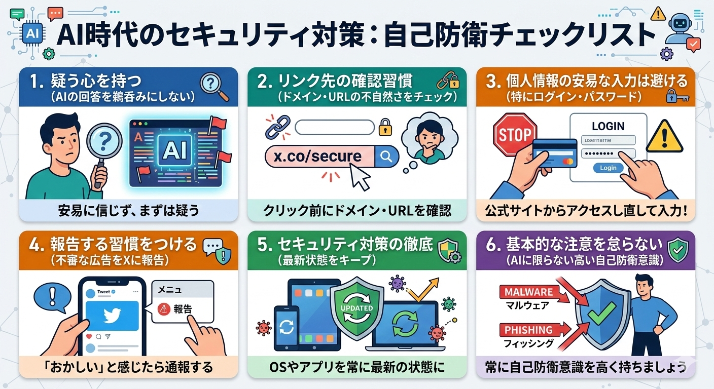 AIが提示するリンクであっても、安易にクリックせず、ドメインやURLが安全かどうかを必ず確認しましょう。