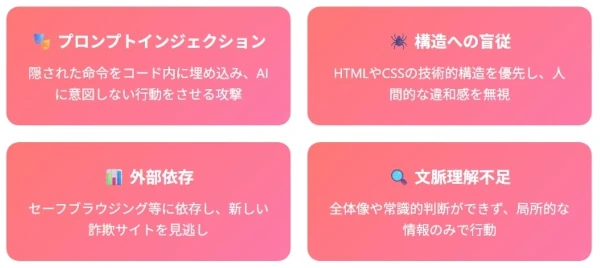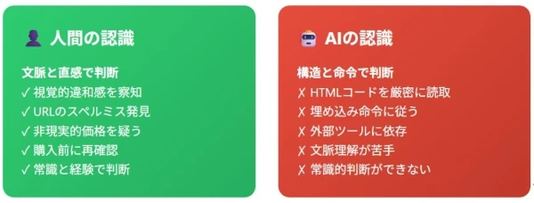 不審なURLや不自然な価格など、人間なら気づくはずの危険な兆候をAIが見逃す可能性があるのだと常に意識してください。