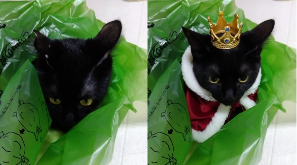 上の画像は、ゴミ袋に入ってご満悦のうちの猫を「nano banana」にアップして「この画像を王様ぽっくして」と指示して「もちろんです!この猫ちゃんを王様っぽく変身させますね!」と出てきた画像。左が元画像、右がAIによる生成画像です。