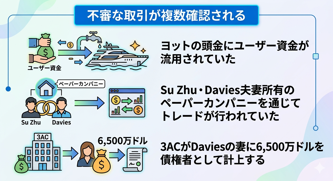 裁判資料によれば、ヨットの頭金にユーザー資金が流用されていたこと、「Tai Ping Shan Ltd(TPS)」というSu Zhu・Davies夫妻所有のペーパーカンパニーを通じてトレードが行われていたこと、3ACがDaviesの妻に6,500万ドルを「債権者」として計上するなど不審な取引が複数確認されています。