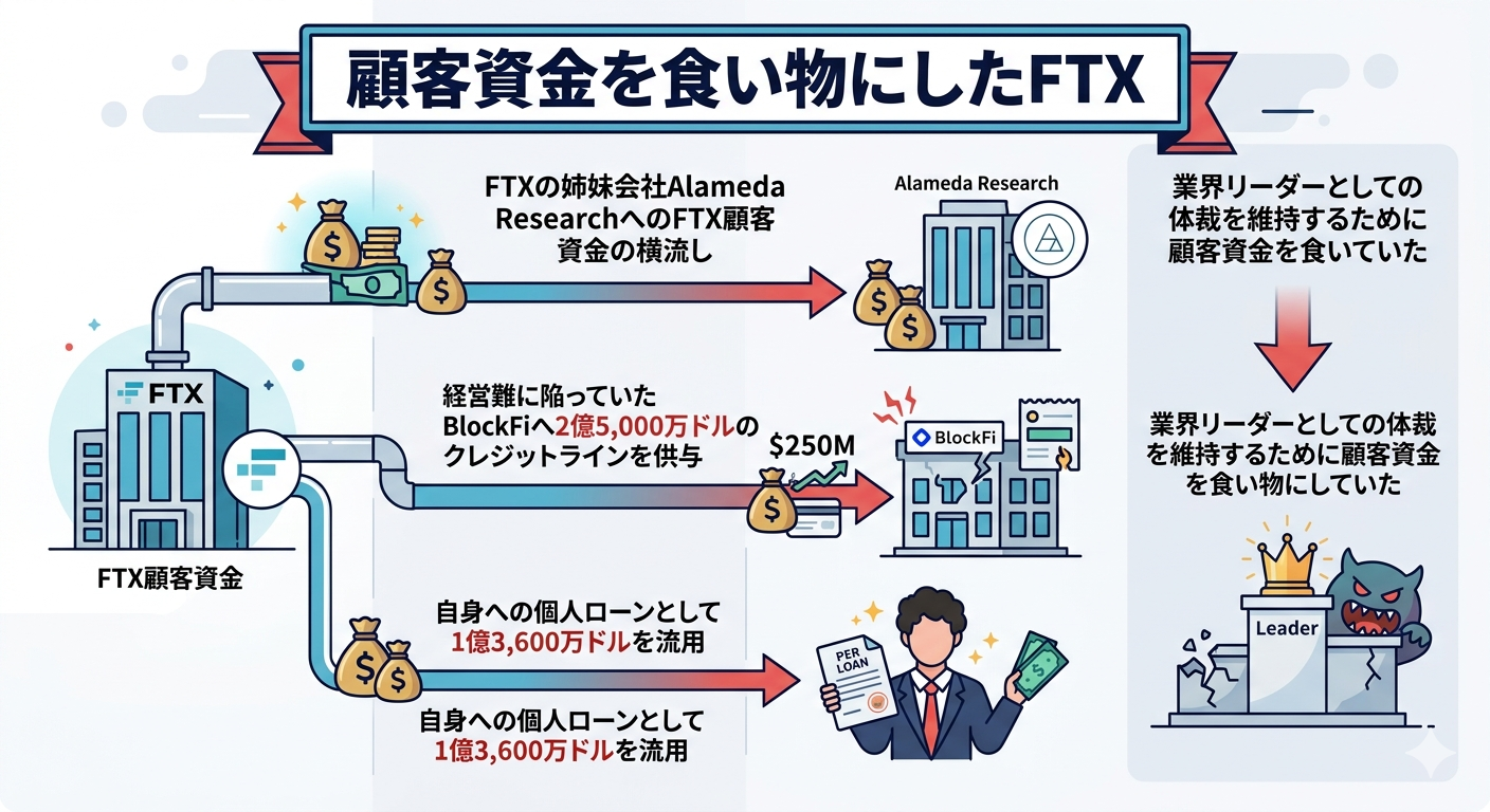 | 詐欺の構造 | 顧客資金約80億ドルを姉妹会社Alameda Researchへ無断流用。 流動性の低い投資・個人流用・政治献金に充当 |
