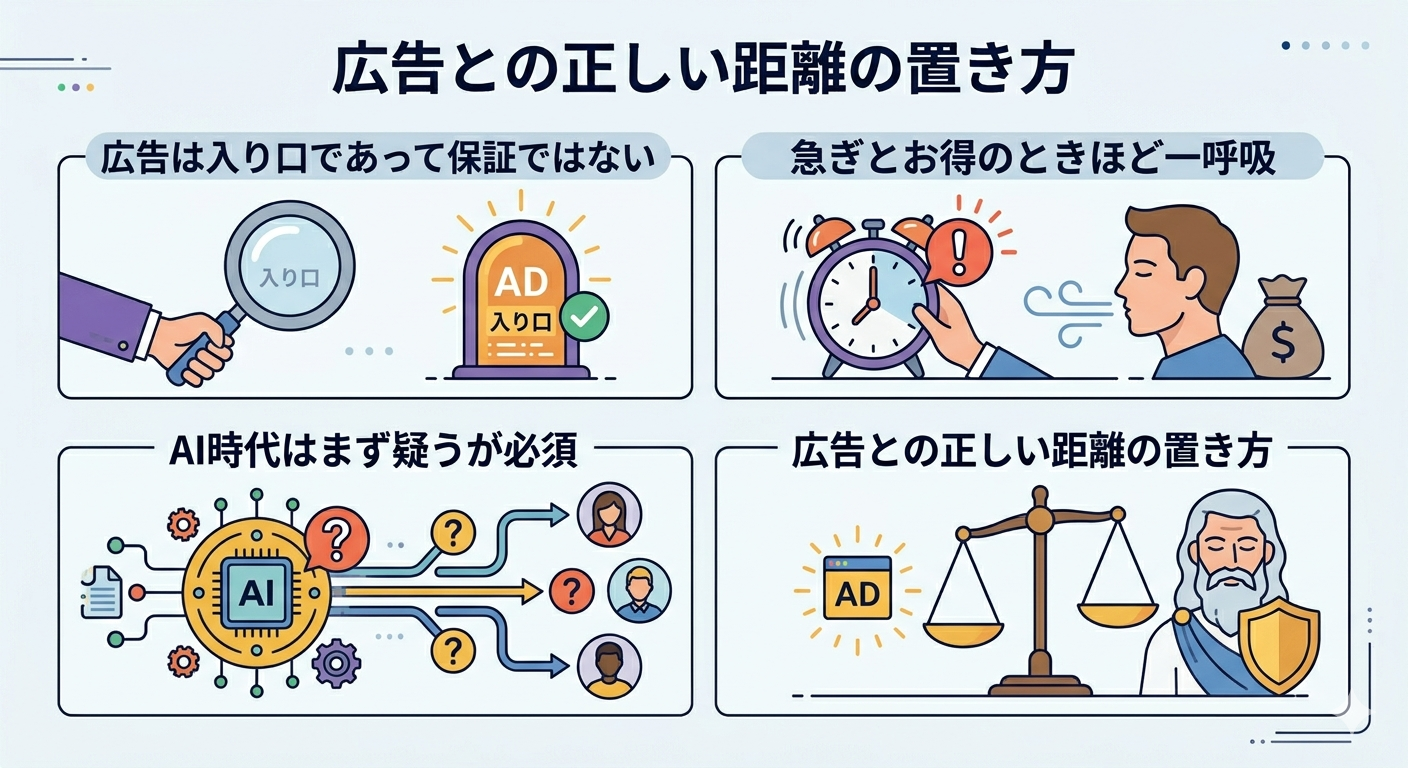 広告との付き合い方は「便利なツールとして使いながら、信頼のよりどころにはしない」という、ほどよい距離感がちょうどいいのです。