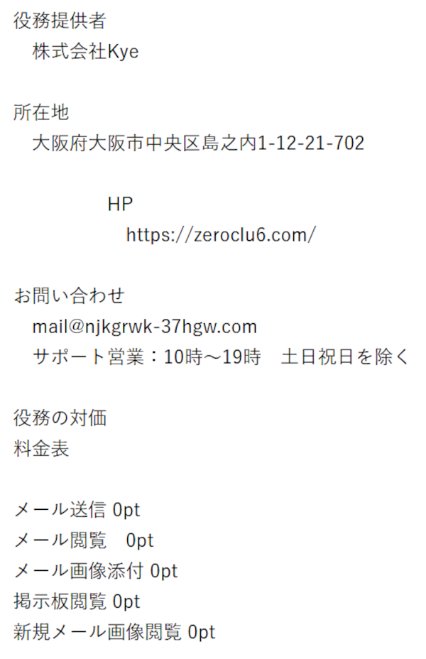 運営会社「株式会社Kye」の表記に電話番号がなく、有料サイトであるにもかかわらず料金表も一切掲載されていません。