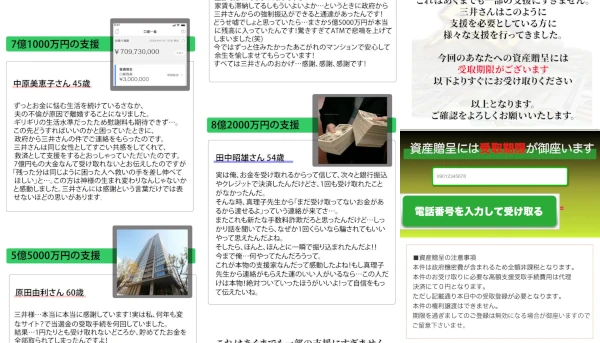 支援詐欺系のメッセージのあるあるのもう一つが、「実際に支援を受けました」という、資産贈呈を受けたとする自作自演のサクラ口コミ。