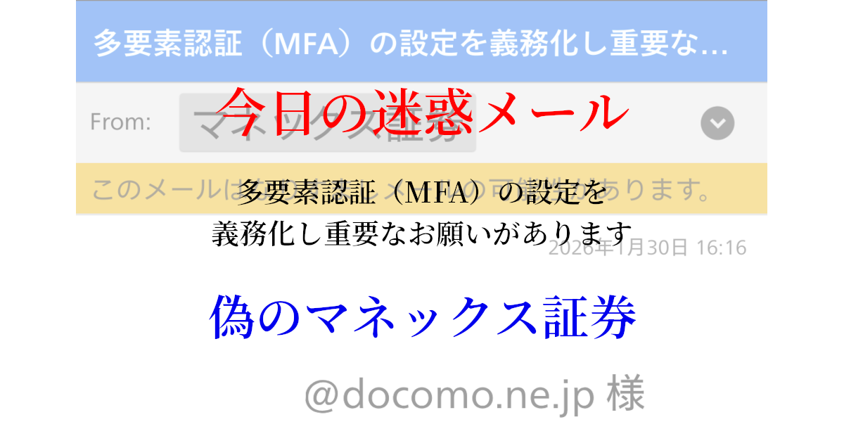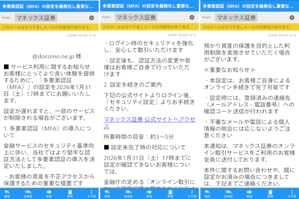 マネックス証券を装い「多要素認証(MFA)の義務化」と称して偽サイトへ誘導するメールが急増。