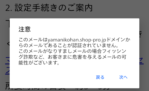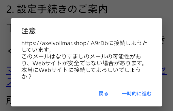 メールのURLにアクセスしようとすると、このように二度注意喚起が出ます。