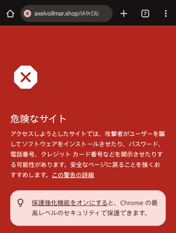 そして実際にアクセスしてみましたが、このような赤い警告画面が表示され、先に進めないようになっていました。
