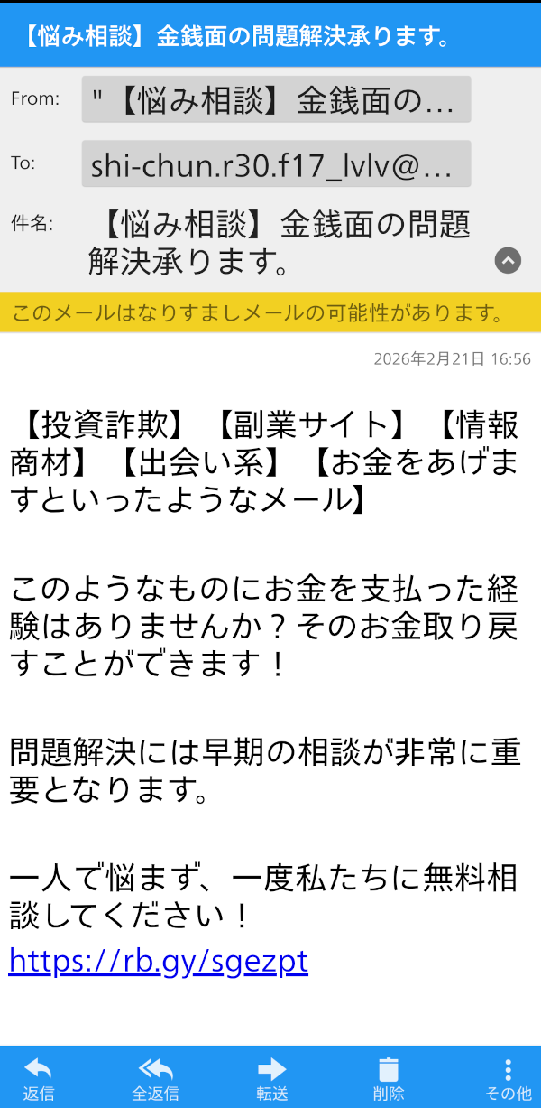 【悩み相談】金銭面の問題解決承ります。そのお金取り戻すことができます!からの迷惑メール