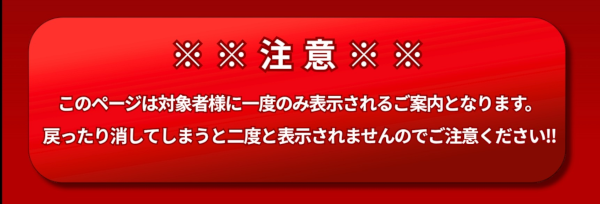 「※※注意※※ このページは対象者様に一度のみ表示されるご案内となります。戻ったり消してしまうと二度と表示されませんのでご注意ください!」