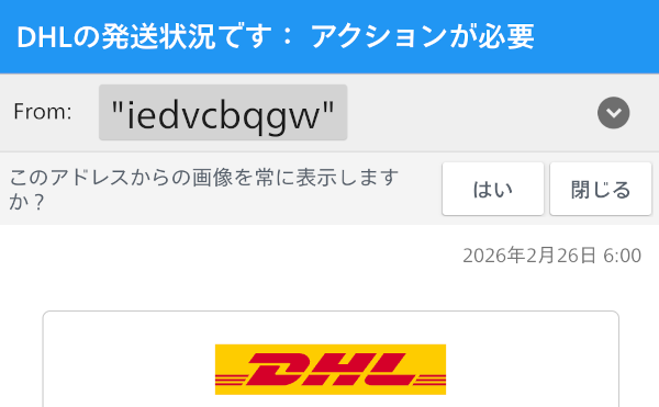 DHLの公式ドメイン(@dhl.com など)ではなく、無関係な文字列のアドレス(例:@alznw.cn)から送信されています。