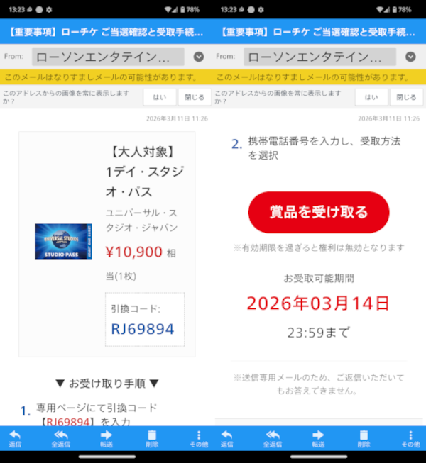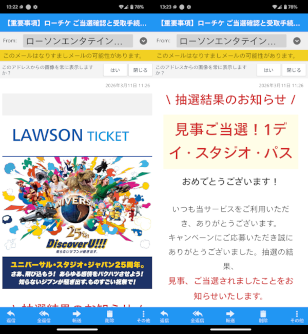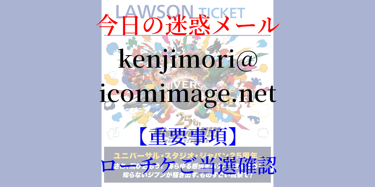 今回紹介するのは、ローソンチケット(ローチケ)を騙り、USJの「1デイ・スタジオ・パス」が当選したように見せかけるフィッシングメールです。