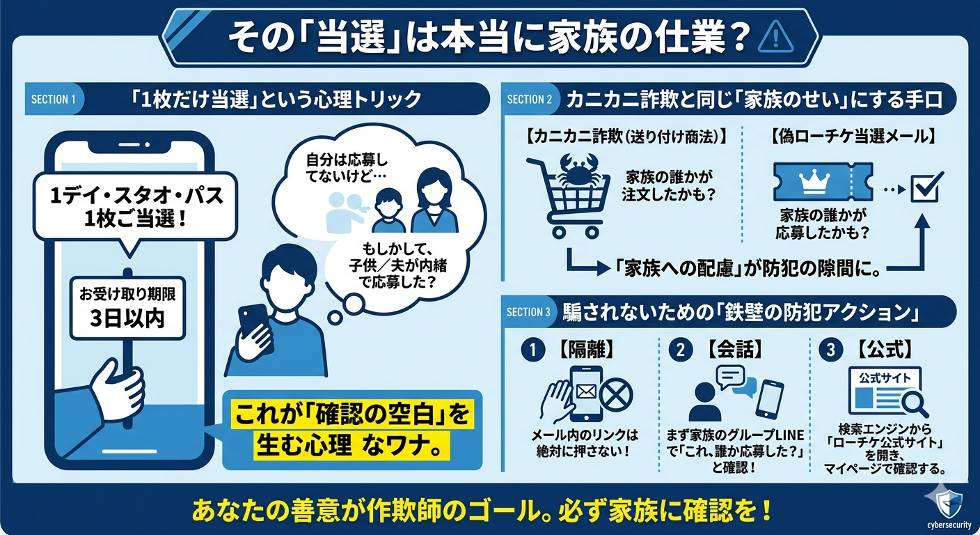 「もし本当に家族が応募していたら、自分が勝手に無効にするのは悪い」という、家族を思う善意がブレーキとなり、公式サイトでの確認するといった冷静な判断を妨げます。