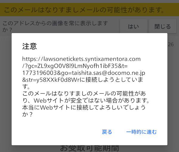 このメールはなりすましのメールの可能性があり、Webサイトが安全ではない場合があります。