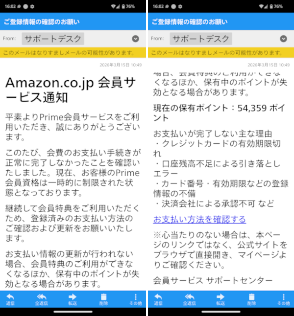 「Prime会員のお支払いが完了しませんでした。現在、会員資格は一時的に制限された状態です。現在の保有ポイント:54,359ポイントが失効する場合があります。」