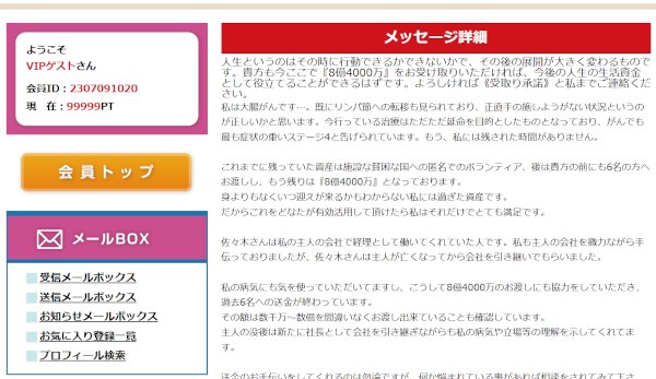 メッセージは、余命幾ばくもないから資産の一部をあなたに受け取ってほしいという内容です。