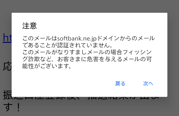 ソフトバンクの公式通知(157)を装っていますが、送信元が個人のようなランダムな英数字のアドレスになっています。
